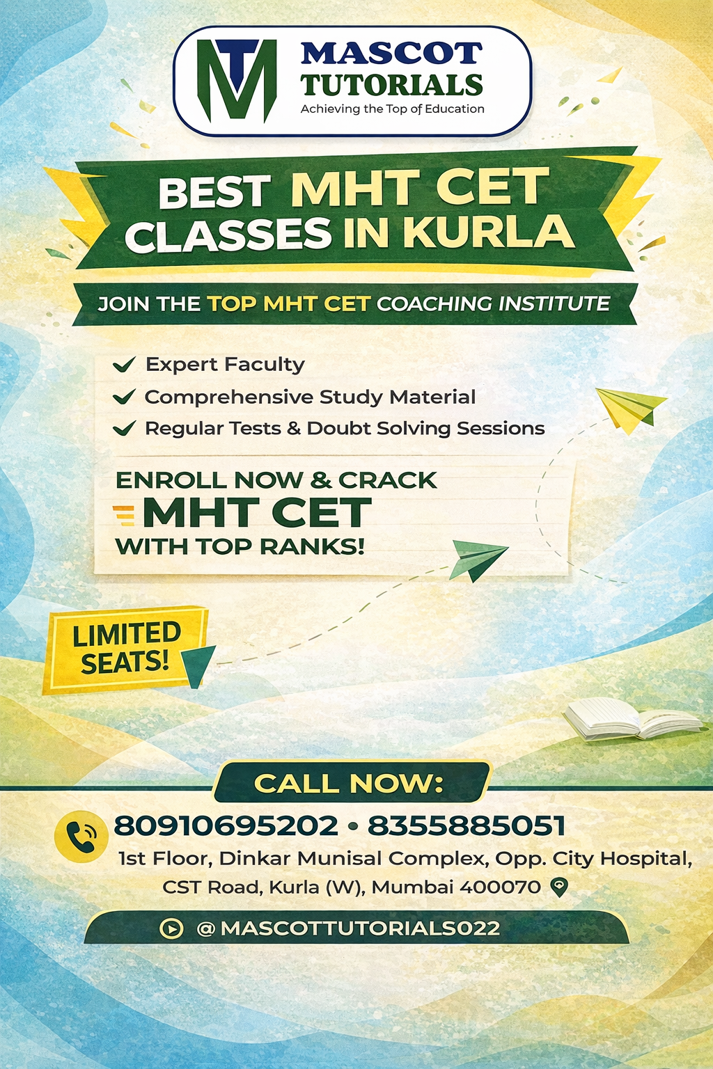 Looking for reliable MHT-CET coaching in Kurla West? Mascot Tutorials provides structured preparation for students aiming to perform confidently in the MHT-CET exam. Our teaching focuses on building strong concepts in Physics, Chemistry, and Mathematics through clear explanations, regular practice, and exam-oriented guidance. Students benefit from experienced faculty, doubt-solving support, periodic assessments, and both offline and online learning options. We help students stay consistent, understand the syllabus thoroughly, and improve problem-solving skills at their own pace. Ideal for students seeking focused MHT-CET preparation in and around Kurla.