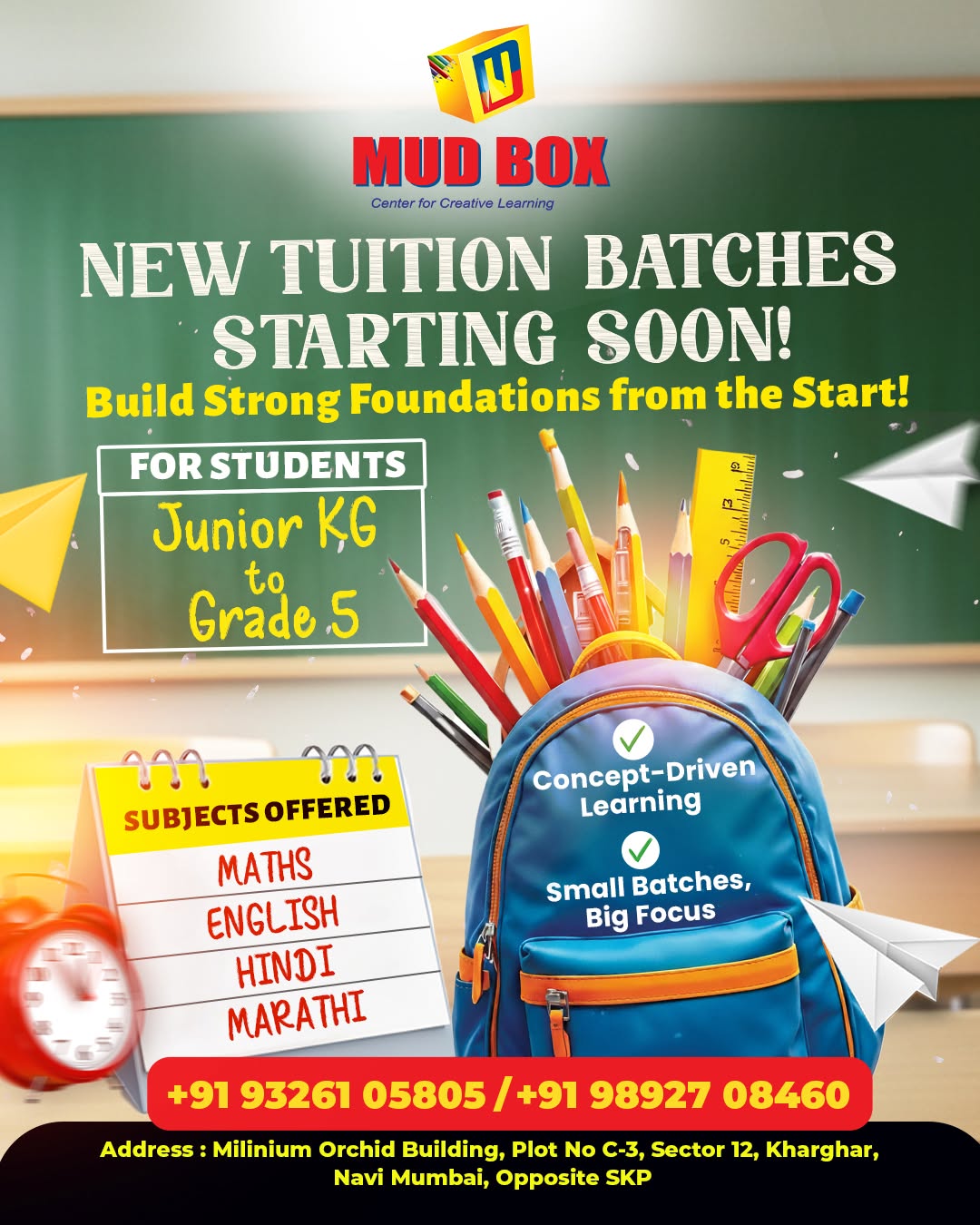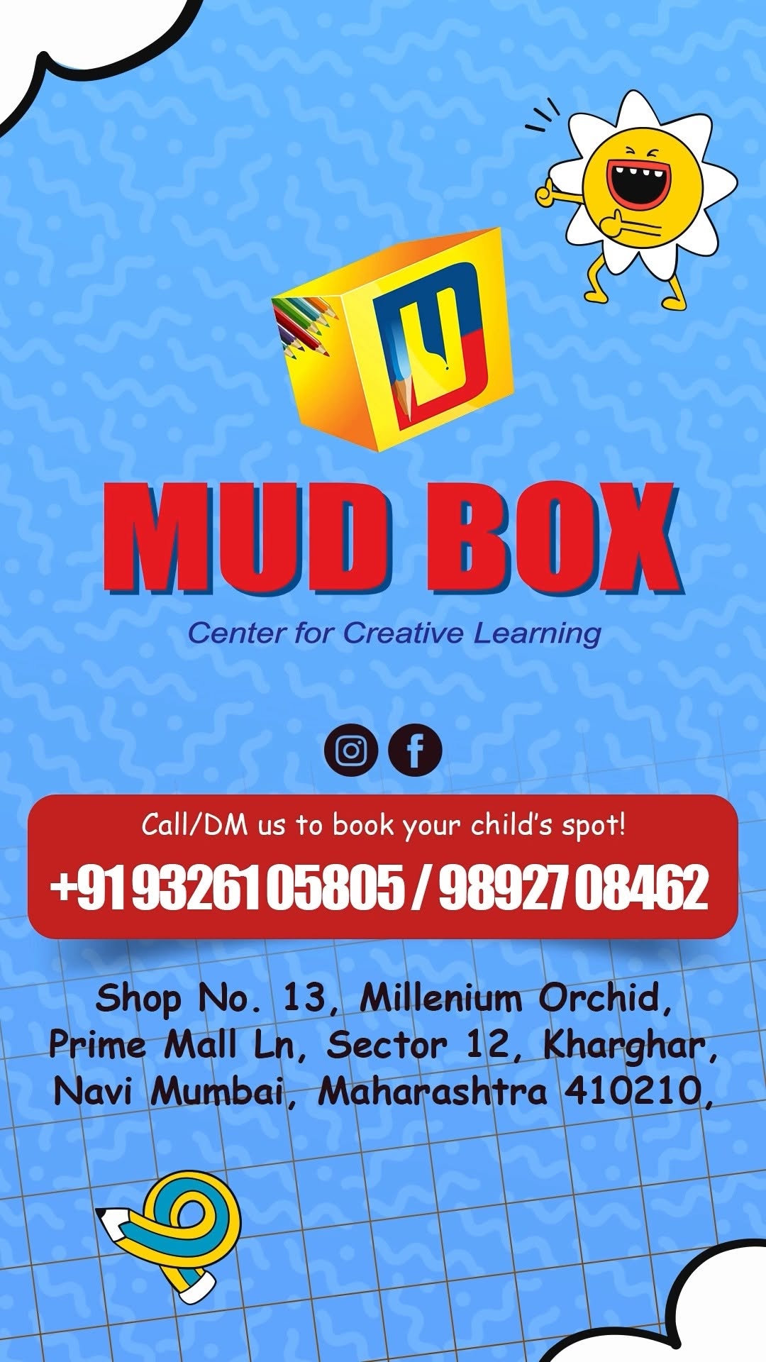 MUD BOX is a child-focused coaching & learning center in Kharghar, Navi Mumbai, since 2017, offering structured academic support & cognitive skill-development programs for kids. We specialize in handwriting improvement (print & cursive) phonics & reading skills speed reading & speed writing super memory techniques mid brain activation personality development confidence & communication skills abacus & Vedic math English speaking & public speaking summer camps, holiday programs & enrichment workshops and concept-based tuition classes from Jr. KG to Grade 5. Designed to improve concentration, confidence, comprehension, vocabulary, & self-expression, helping children perform better in school, presentations, & everyday communication.