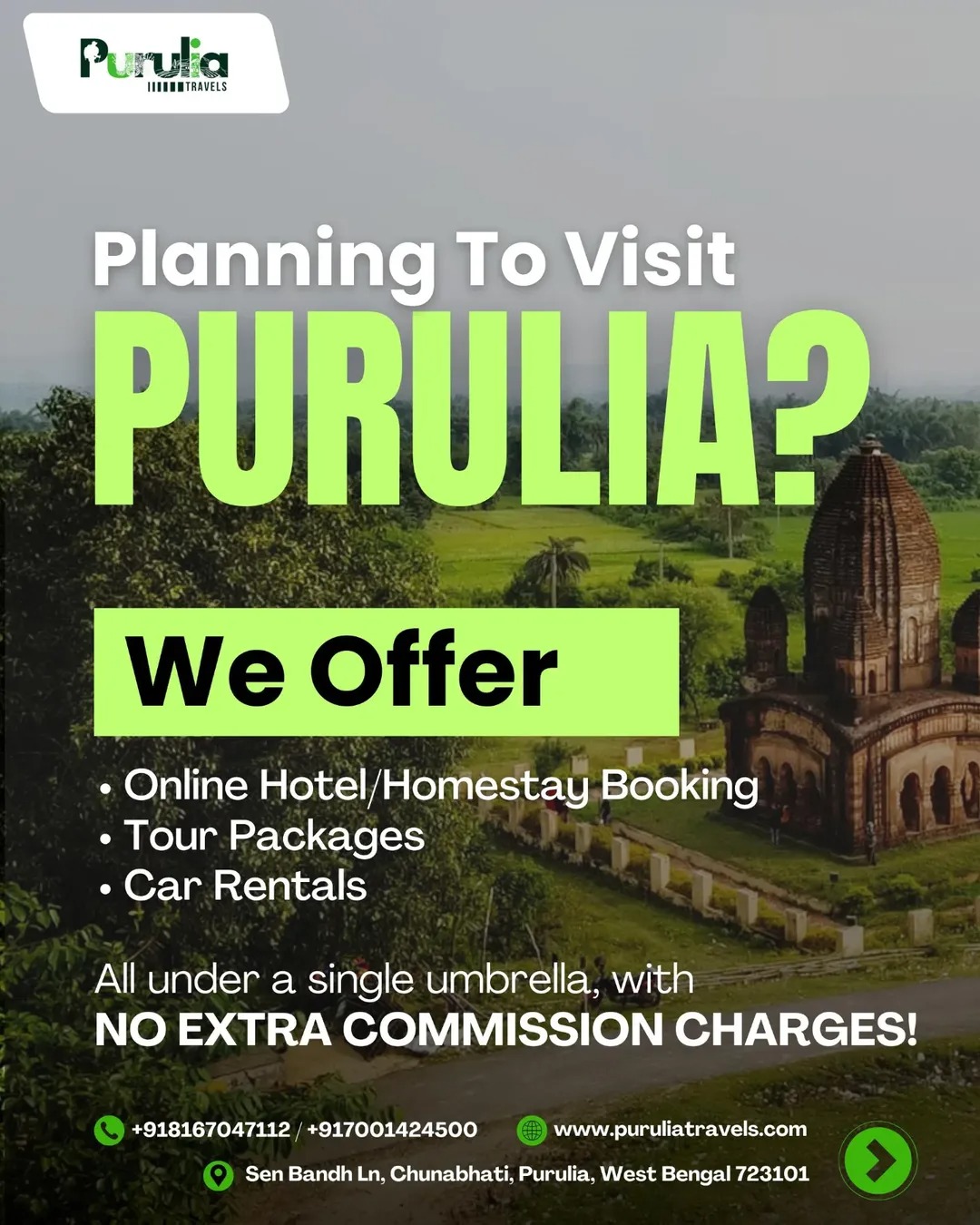Purulia Travels is a local travel company based out of Purulia Town. We offers customized tour packages, online hotel booking and car rental in Purulia, aggregated with verified and curated hotels, homestays, camps and resorts in Purulia, West Bengal. We love finding and visiting these unique properties, which you will not find anywhere in the digital world and where you will enjoy an unique experience from the others. We also provide customizable tour packages around these properties with some of the authentic touch of local tribal culture, that are eco-conscious, and community-driven.